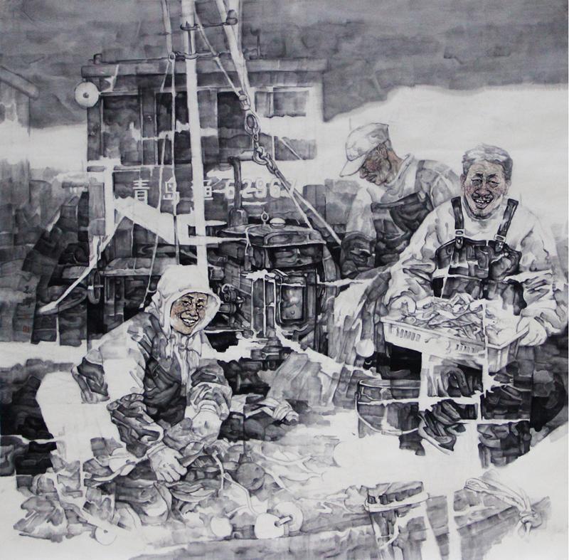 張春海的國畫作品《漁歌》以家鄉(xiāng)青島發(fā)達(dá)的海產(chǎn)業(yè)為背景,是對家鄉(xiāng)生活的寫照。張春海三歲隨父母到青島,在海邊長大,漁民忙碌的身影會讓他回憶起兒時與父親一起去海邊忙活。來到武漢學(xué)習(xí),家鄉(xiāng)情結(jié)也是他一直想要嘗試的創(chuàng)作主題。張春海對畫中的人物形象和神態(tài)下了一番功夫,他不想隨便一畫,不僅要讓他們是漁民,而且要是憨厚歡樂的青島漁民形象。由此為主體再去營造畫面的氛圍,柴油機(jī)漁船作背景就極好。這樣貫穿下來便產(chǎn)生了這幅作品,定位仍是家長情結(jié),用結(jié)實的造型表現(xiàn)漁民的生活狀態(tài)和精神面貌以及家鄉(xiāng)的環(huán)境。