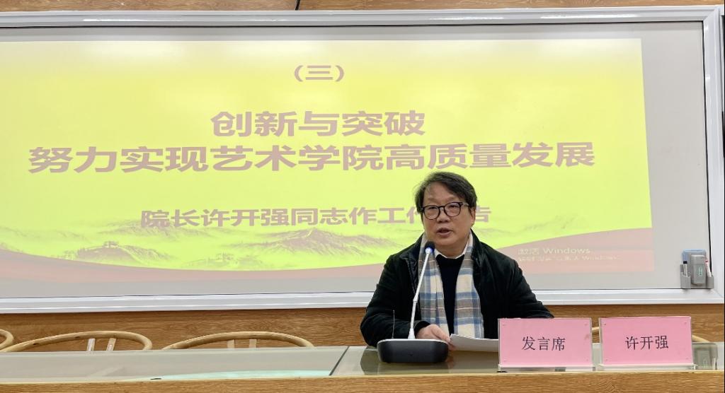 會上,院長許開強作《創(chuàng)新與突破,努力實現(xiàn)藝術學院高質量發(fā)展》的主題報告。報告從深化黨建和思想政治教育,科學制定學院“十四五”規(guī)劃,全面加強內涵建設等方面對學院“十三五”期間來各項工作成績進行了全面總結,并明確提出了2022年的工作要點。