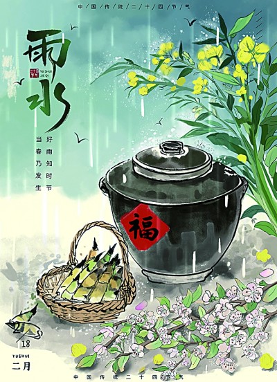 《雨潤豐年》(圖④)表現(xiàn)了雨水時(shí)節(jié)的自然景象與生活元素。杏花、桃花、油菜花傳遞著春天的花語,新鮮的春筍是應(yīng)季的食材,罐罐肉是南方一些地區(qū)雨水節(jié)氣前后常見的傳統(tǒng)美食。作品整體傳達(dá)出春暖花開、共享美好生活的溫馨氛圍。