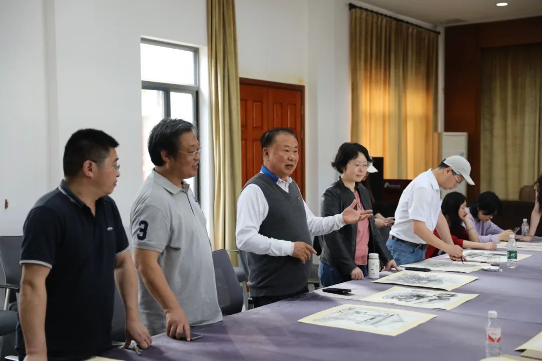 寫(xiě)生結(jié)束,董繼寧教授與工作站負(fù)責(zé)人譚崇正、進(jìn)站教師鄧?guó)櫇埩ⅰ⑼跷挠〉葒惶茫槍?duì)每幅作品的構(gòu)圖、筆墨與意境展開(kāi)深入探討。既肯定青年學(xué)子的創(chuàng)新勇氣,也提醒其在傳統(tǒng)與現(xiàn)代之間尋找繪畫(huà)的語(yǔ)言,在技法與思想之間追求共鳴。墨香與智慧交織,藝術(shù)的火種在交流中傳遞。