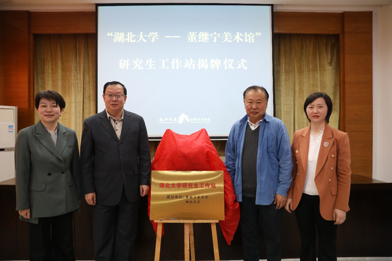 湖北大學(xué)藝術(shù)與設(shè)計(jì)學(xué)院名譽(yù)院長(zhǎng)董繼寧,湖北大學(xué)研究生院院長(zhǎng)王賢保、藝術(shù)與設(shè)計(jì)學(xué)院黨委書(shū)記葉秀娟,咸安區(qū)委常委、宣傳部部長(zhǎng)丁玲共同為“湖北大學(xué)——董繼寧美術(shù)館”研究生工作站揭牌。咸安區(qū)委宣傳部副部長(zhǎng)、文聯(lián)主席胡劍芳,湖北大學(xué)藝術(shù)與設(shè)計(jì)學(xué)院副院長(zhǎng)潘鋒,“湖北大學(xué)——董繼寧美術(shù)館”研究生工作站負(fù)責(zé)人譚崇正,董繼寧美術(shù)館館長(zhǎng)鄭文婷,研究生工作站入站老師鄧?guó)櫇埩ⅰ⑼跷挠〕鱿遗苾x式。湖北大學(xué)中國(guó)畫(huà)方向全體研究生、美術(shù)館全體成員共同見(jiàn)證這一具有里程碑的重要時(shí)刻。