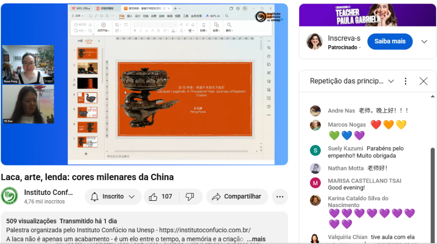 5月10日晚,湖北大學(xué)-巴西圣保羅州立大學(xué)孔子學(xué)院舉辦了一場以《漆?藝?傳奇:穿越千年的東方色彩》為主題的講座,吸引了500多名線上觀眾參與。講座主講人彭茹娜是湖北大學(xué)藝術(shù)與設(shè)計學(xué)院副教授、湖北大學(xué)大漆研究與國際傳播中心主任,也是湖北省文聯(lián)中青年優(yōu)秀文藝人才、湖北省民間文藝家協(xié)會工藝美術(shù)委員會副主任和湖北省民間工藝美術(shù)特殊技能傳承人。