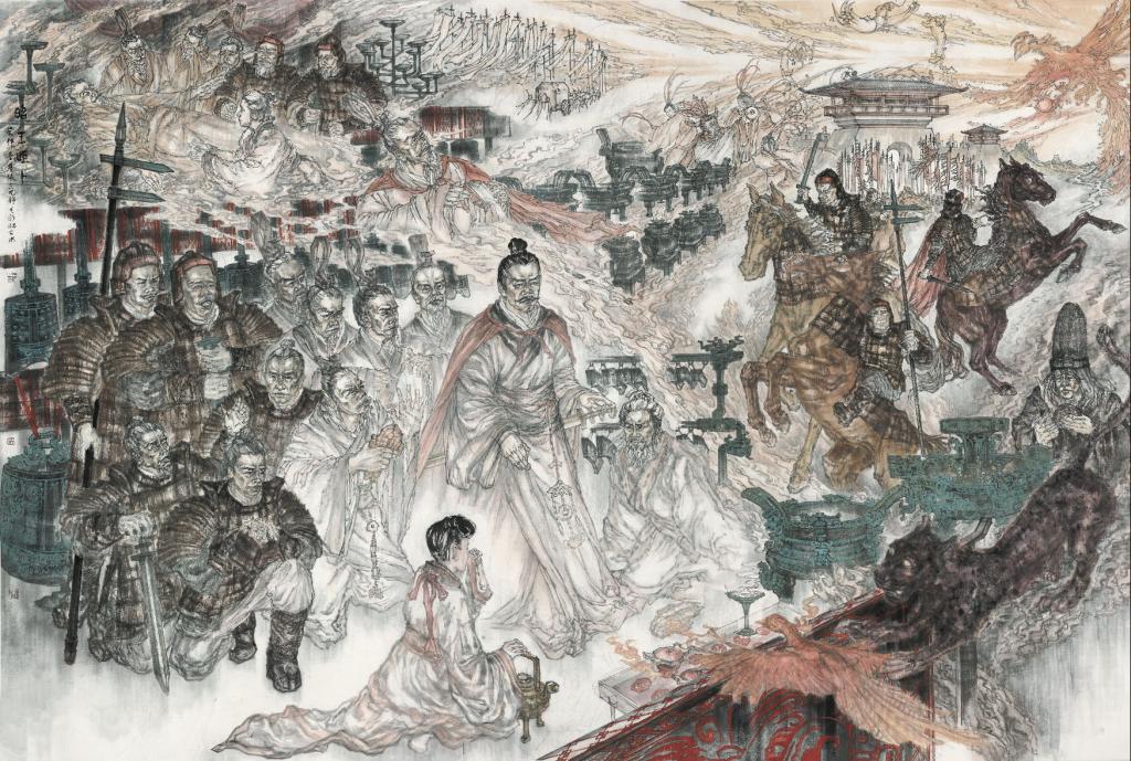 作品簡(jiǎn)介:《昭王拒卜》題材來(lái)源于楚國(guó)中興之主楚昭王命終的典故記載。楚昭王二十七年,楚昭王救助陳國(guó)抗擊吳軍,駐軍在城父。十月,昭王病倒在軍中。連續(xù)三日落日時(shí)紅色云霞象鳥一樣,圍繞太陽(yáng)飛翔。昭王將此天象向周太史詢問(wèn)吉兇,回復(fù)卦象對(duì)楚王有害,把災(zāi)禍移到將相身上,王可免災(zāi)。將相請(qǐng)求替王受災(zāi),昭王認(rèn)為將相如同我的手足,昭王不同意。再次占卜病因?yàn)辄S河在作祟,大夫們請(qǐng)求祭祀黃河神。昭王也拒絕了。后昭王將死,托公子啟繼王位,啟假意受命,昭王死。本作品圍繞著楚國(guó)中興之主楚昭王行將去世的故事展開:1落日火鳳異象,2請(qǐng)巫卜卦祈禱、3王拒轉(zhuǎn)禍于臣、4王拒祭河神、5命終歸太虛。作品用環(huán)形結(jié)構(gòu)竄起故事5個(gè)片段。環(huán)形啟點(diǎn)與終點(diǎn)交匯于日落天象。其中以鳳鳥、黑豹、龜甲、大雁等動(dòng)物形象、變幻于火焰、云霧之中,增強(qiáng)楚國(guó)占卜的神秘色彩,反映了人們對(duì)未知世界的探求和對(duì)命運(yùn)的關(guān)注。畫中人物從驚懼-愁憂-悲絕-悵茫的情緒變化來(lái)表現(xiàn)故事發(fā)展。體現(xiàn)中國(guó)人生命往復(fù)的樸素自然觀。“昭王拒卜”典故是一首悲傷的英雄幕落之歌,孔子評(píng)價(jià)此事為“楚昭王通大道矣。”昭王拒卜故事包含了古代中國(guó)的君之德、臣之義、生死之道。為了表現(xiàn)循環(huán)往復(fù)的自然變化,畫以云、火元素的變形穿插于主結(jié)構(gòu)線中,暗示故事發(fā)展,渲染一代君王日暮之氣。畫面前景主體為君臣環(huán)繞的人物組像,表現(xiàn)楚昭王得知占卜結(jié)果之時(shí),群臣圍繞議論勸說(shuō),昭王拒絕太史公和巫師的提議,篤定面對(duì)天道生死的情景。畫面遠(yuǎn)景部分昭王病逝、扶靈回鄉(xiāng),云騰星現(xiàn),大雁南回。色調(diào)以灰調(diào)子為主,前景厚重、后景輕虛,整體墨色暗沉,色彩灰淡,展現(xiàn)一代楚王落幕的悲傷場(chǎng)景。