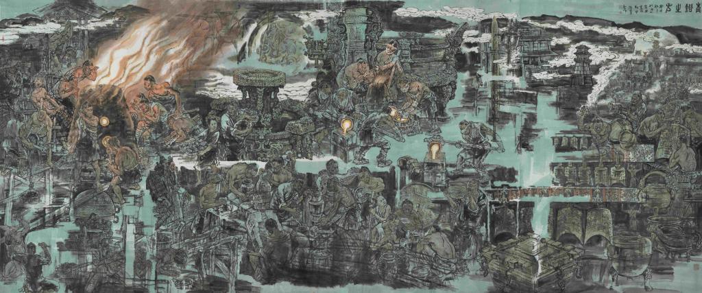 作品簡(jiǎn)介:在先秦時(shí)期,青銅不僅是制作冷兵器上好的材料,也是國(guó)家財(cái)富和實(shí)力的象征,是祭祀中與神對(duì)話的工具,也諸侯中稱霸的資本。楚國(guó)意識(shí)到要發(fā)展、要稱霸,不能沒(méi)有青銅。于是堅(jiān)持“篳路藍(lán)縷,以啟山林”,以銅立國(guó),致楚國(guó)國(guó)力大增。歷代楚王利用積蓄的強(qiáng)大青銅資源鑄造的精良兵器,攻滅附近的庸國(guó),使楚國(guó)勢(shì)力向西北擴(kuò)展。最終,“飲馬黃河”,“問(wèn)鼎中原”,楚莊王實(shí)現(xiàn)了先祖稱霸諸侯的愿望。楚國(guó)青銅器制作工藝非常高超,制作器型多種多樣,審美上也與中原青銅器有很明顯的差異,皆以繁復(fù)多變?yōu)槊溃钥⌒闳岷蜑槊溃宰杂杀挤艦槊溃粝铝藬?shù)量巨大、種類繁多的國(guó)之瑰寶,是中華民族青銅時(shí)代最重要的組成部分。作品《青銅文明》以青銅的發(fā)現(xiàn)、開釆、冶煉、成型和運(yùn)用為線索展開,以現(xiàn)主義手法深入刻畫了尊盤、越王勾踐劍、王子午鼎、編鐘等幾十個(gè)實(shí)物青銅器個(gè)性特征,畫幅左邊一爐火燒出了燦爛的青銅時(shí)代璀璨奪目的中華文明。是國(guó)家提出對(duì)傳統(tǒng)文化要?jiǎng)?chuàng)造性轉(zhuǎn)換和創(chuàng)新性發(fā)展的具體體現(xiàn)。