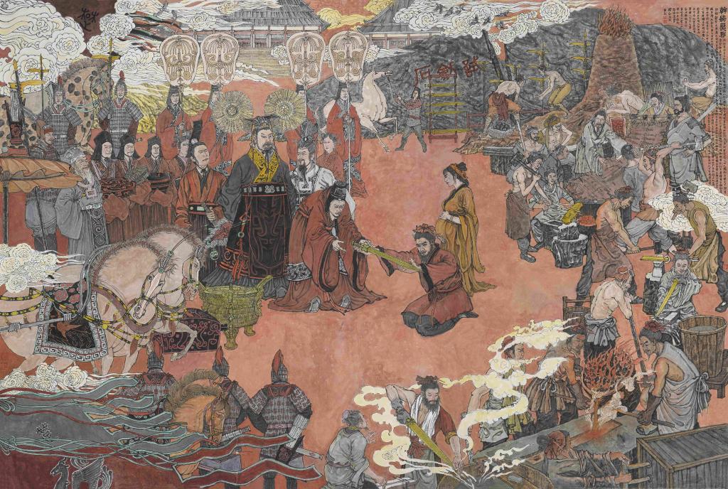 作品簡(jiǎn)介:干將莫邪是古代中國(guó)神話傳說(shuō),最早出自出漢代劉向《列士傳》和《孝子傳》中,如今,最流行的版本為志怪小說(shuō)集《搜神記》中所記干將莫邪的故事。干將,春秋時(shí)吳國(guó)人,是在楚國(guó)工作的最有名的鐵匠,他打造的劍鋒利無(wú)比。曾與其妻莫邪奉命為楚王鑄劍,劍成兩把,一曰干將,一曰莫邪(也作鏌铘)。他知楚王性格乖戾,特先將雄劍托付其妻傳給其子防備,后將雌劍獻(xiàn)于楚王,后果真被楚王所殺。其子成人后成功完成父親遺愿,將楚王殺死,為父報(bào)仇。該故事內(nèi)容豐富,情節(jié)跌宕起伏,可歌可泣,贊頌了劍工高超的技藝和少年的壯烈,批判了古代統(tǒng)治者的殘暴。本作品根據(jù)故事內(nèi)容構(gòu)思,以史詩(shī)般宏大的敘事方式描繪了楚王帶眾隨從到鑄劍坊視察驗(yàn)收工作,干將莫邪獻(xiàn)劍的視覺(jué)形象。作品用楚王的親臨和宏大的皇家儀仗展現(xiàn)楚王對(duì)干將莫邪的重視。在表現(xiàn)鑄劍坊時(shí)力求通過(guò)冶煉礦石、研發(fā)鑄劍樣式、錘煉、淬火、磨劍等場(chǎng)面,呈現(xiàn)眾人熱火朝天鑄劍的工作狀態(tài)。由此展現(xiàn)我國(guó)春秋戰(zhàn)國(guó)時(shí)代精湛的青銅冶煉技術(shù)和干將莫邪獨(dú)步青云的造劍水平,激發(fā)觀眾對(duì)楚國(guó)文化的濃厚興趣,弘揚(yáng)中華傳統(tǒng)文化。該作品采用了“O”形構(gòu)圖,在黃金分割點(diǎn)的位置安排干將莫邪的形象。造型上人物、鞍馬均采用意象性造型,采用工筆重彩勾線設(shè)色效果。手法上采用“現(xiàn)實(shí)主義+浪漫主義”,使得情節(jié)既真實(shí)可信,又具有楚風(fēng)浪漫特質(zhì)。