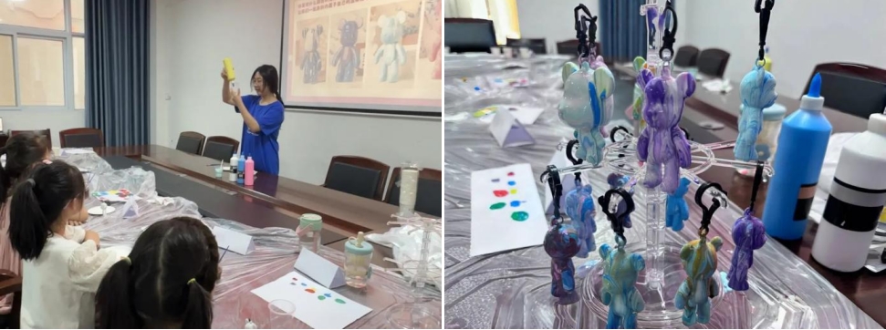 趣味流體熊手工課。活動中先通過投影展示色彩絢麗的流體熊作品激發(fā)孩子們的興趣,隨后,大家便興致勃勃地動手調(diào)配顏料,看著不同顏色交融出奇妙色調(diào),臉上滿是驚喜。在志愿者的指導下,孩子們將顏料緩緩倒在小熊模具上,看著色彩自然流淌形成獨特紋路,笑聲不斷,孩子們舉著專屬流體熊相互分享,在輕松歡樂中體會色彩碰撞的樂趣與創(chuàng)作的童趣。