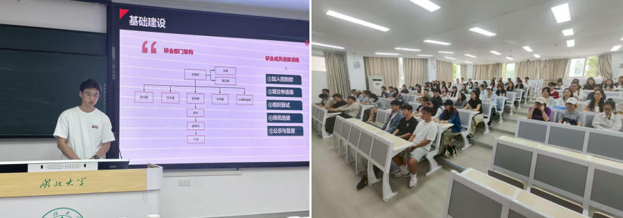 美術(shù)學(xué)2023級(jí)朱詩雨、設(shè)計(jì)學(xué)2023級(jí)胡夢(mèng)彬結(jié)合自身經(jīng)歷,從學(xué)業(yè)規(guī)劃、科研方法、實(shí)習(xí)求職、生活調(diào)節(jié)四個(gè)方面進(jìn)行了分享,以“過來人”和“學(xué)姐”的視角為新生答疑解惑;隨后,研究生會(huì)主席沈佳園上臺(tái)開展招新宣講,為新生展示研會(huì)的組織架構(gòu)與活動(dòng)體系,詳細(xì)介紹研會(huì)各部門職能,強(qiáng)調(diào)研會(huì)是“鍛煉能力、結(jié)交摯友、豐富研究生生活”的重要平臺(tái),邀請(qǐng)新生根據(jù)自身興趣與特長(zhǎng)報(bào)名,共同參與研會(huì)建設(shè)。