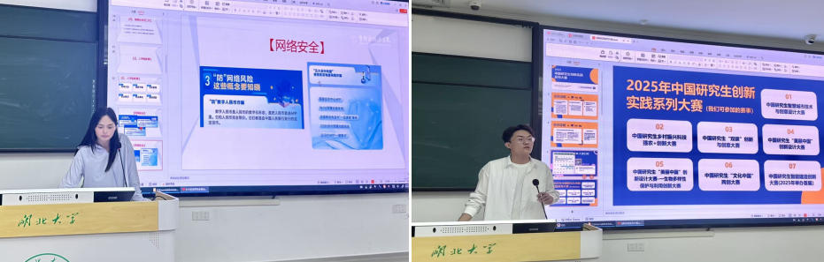 班會(huì)伊始,班主任黃佳佳老師以“融入與規(guī)劃”為核心,依次從日常管理規(guī)范、獎(jiǎng)學(xué)金與助學(xué)金政策、周期性學(xué)術(shù)與實(shí)踐任務(wù)、安全教育四個(gè)方面進(jìn)行了說明;輔導(dǎo)員張瑀老師聚焦“資源對(duì)接與能力提升”,為新生全面介紹學(xué)院師資力量構(gòu)成、科研平臺(tái)布局及使用規(guī)則,并重點(diǎn)解讀中國(guó)研究生創(chuàng)新實(shí)踐系列大賽,從賽事背景、報(bào)名流程、備賽要點(diǎn)到獎(jiǎng)項(xiàng)價(jià)值,進(jìn)行全流程拆解,鼓勵(lì)新生以賽事為契機(jī),提升科研實(shí)踐與團(tuán)隊(duì)協(xié)作能力。
