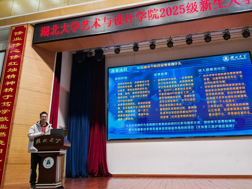 10月24日下午,湖北大學(xué)藝術(shù)與設(shè)計學(xué)院在三號樓學(xué)術(shù)報告廳成功舉辦了2025級新生入學(xué)教育系列活動。本次活動以“藝啟創(chuàng)·智匯未來”為主題,聚焦藝術(shù)與設(shè)計領(lǐng)域創(chuàng)新創(chuàng)業(yè)教育,旨在引導(dǎo)新生樹立創(chuàng)新意識、激發(fā)創(chuàng)業(yè)熱情,為未來學(xué)業(yè)發(fā)展與職業(yè)規(guī)劃奠定堅實基礎(chǔ)。創(chuàng)新創(chuàng)業(yè)學(xué)院院長夏曉紅、院黨委副書記談玉婷、學(xué)院輔導(dǎo)員、中國國際大學(xué)生創(chuàng)新大賽獲獎代表以及2025級全體新生共同參與活動。