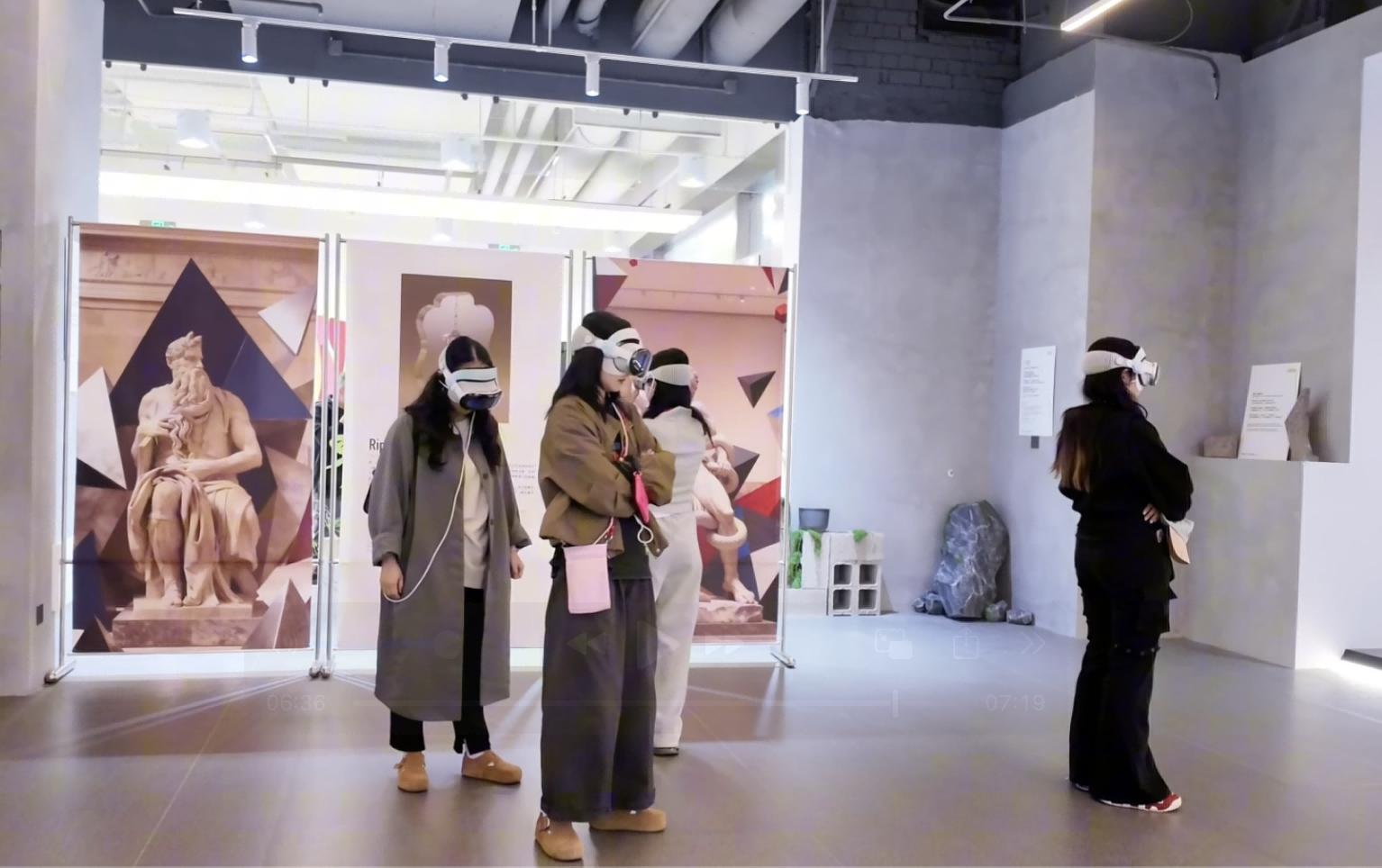 在上海的最后一站,考察團(tuán)重點(diǎn)聚焦數(shù)字藝術(shù)產(chǎn)業(yè)園區(qū)與商業(yè)數(shù)字藝術(shù)空間,參觀了多家新媒體藝術(shù)展廳,欣賞了數(shù)字繪畫、互動(dòng)裝置及沉浸式表演等多樣化藝術(shù)形態(tài),深入了解了產(chǎn)業(yè)園區(qū)在創(chuàng)意孵化、資源整合和與市場轉(zhuǎn)化中的運(yùn)作機(jī)制。特別是在上海中華藝術(shù)宮的《達(dá)·芬奇·時(shí)空之輪》和艾洛互動(dòng)公司的《地球文明博物館》MR沉浸式藝術(shù)體驗(yàn)展中,師生們親身體驗(yàn)了基于頭戴式MR設(shè)備的大空間沉浸式藝術(shù)創(chuàng)作形式。展覽通過混合現(xiàn)實(shí)(MR)技術(shù)將虛擬影像與現(xiàn)實(shí)空間實(shí)時(shí)融合,觀眾在佩戴頭顯后可自由行走、交互觀察,在虛擬與現(xiàn)實(shí)的疊加環(huán)境中感受藝術(shù)敘事的空間延展與動(dòng)態(tài)生成。