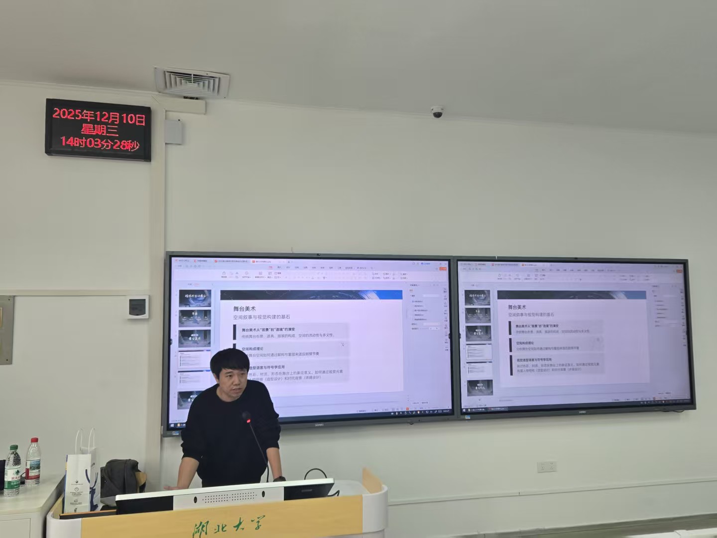 12月10日,湖北大學(xué)藝術(shù)與設(shè)計(jì)學(xué)院特邀湖北電視臺(tái)高級(jí)舞美設(shè)計(jì)總監(jiān)吳凡偉先生走進(jìn)研究生課堂教授《設(shè)計(jì)理論前沿與創(chuàng)新應(yīng)用》課程,開展專業(yè)實(shí)踐教學(xué)活動(dòng)。本次活動(dòng)聚焦舞臺(tái)美術(shù)領(lǐng)域的前沿理念與實(shí)踐經(jīng)驗(yàn),通過(guò)作品解析、流程拆解與行業(yè)洞察的深度結(jié)合,為設(shè)計(jì)專業(yè)研究生帶來(lái)行業(yè)認(rèn)知的全面升級(jí)。
