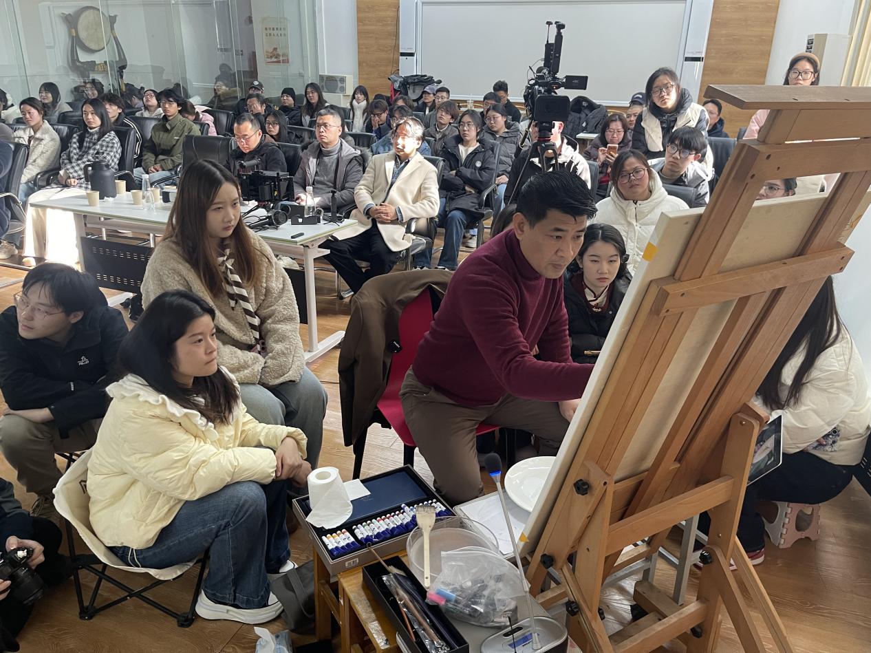 隨后,黃華兆教授作了題為“融合與拓展——水彩畫藝術(shù)語言探索之路”的學(xué)術(shù)講座。他從水彩畫的媒介特性出發(fā),系統(tǒng)梳理了其從西方實用繪圖發(fā)展為獨立畫種的歷史脈絡(luò),結(jié)合透納、薩金特等大師案例,闡釋了水彩在色彩、光影、筆觸等方面的演進。黃教授重點分享了個人在創(chuàng)作中融匯水彩、油畫、水墨及坦培拉等多種語言的藝術(shù)實踐,并通過《天語-輕羽》《路盛世題》《甘南組畫-晨光》等代表作,生動展現(xiàn)了跨文化、跨畫種融合的創(chuàng)作路徑。他強調(diào),藝術(shù)創(chuàng)新需打破邊界、廣采博收,方能形成獨特的個人表達。講座最后,他就水彩與中國傳統(tǒng)圖騰、水墨材料的進一步融合等問題,與在場師生展開交流。