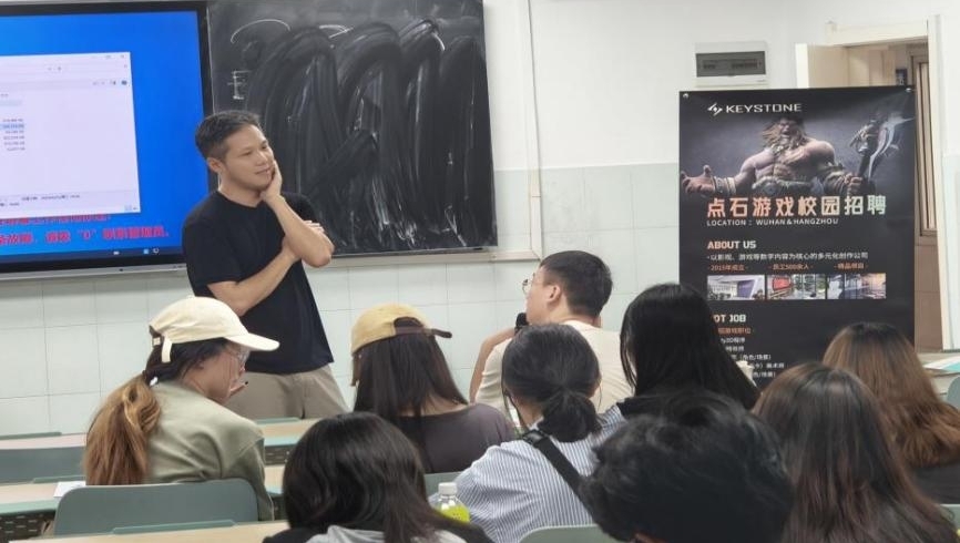 點石數(shù)碼設(shè)計有限公司美術(shù)總監(jiān)胡江濤和HR胡海浪在宣講中詳盡闡述了公司的獨特文化內(nèi)核、堅實的技術(shù)底蘊、近期引人注目的熱門項目案例以及前瞻性的未來發(fā)展規(guī)劃。通過系統(tǒng)化的介紹,展現(xiàn)了公司在行業(yè)內(nèi)的穩(wěn)健步伐與創(chuàng)新活力,深刻剖析了各招聘崗位的具體職責(zé)、嚴(yán)格的任職要求以及清晰明確的職業(yè)發(fā)展路徑,為求職者勾勒出一幅既充滿挑戰(zhàn)又前景廣闊的職業(yè)藍(lán)圖。在宣講過程中,同學(xué)們?nèi)褙炞ⅲ粫r記錄重要信息。當(dāng)講到職業(yè)規(guī)劃部分時,許多同學(xué)紛紛舉手提問,就游戲行業(yè)的發(fā)展趨勢、個人在公司的成長空間等問題與宣講人進行深入交流。