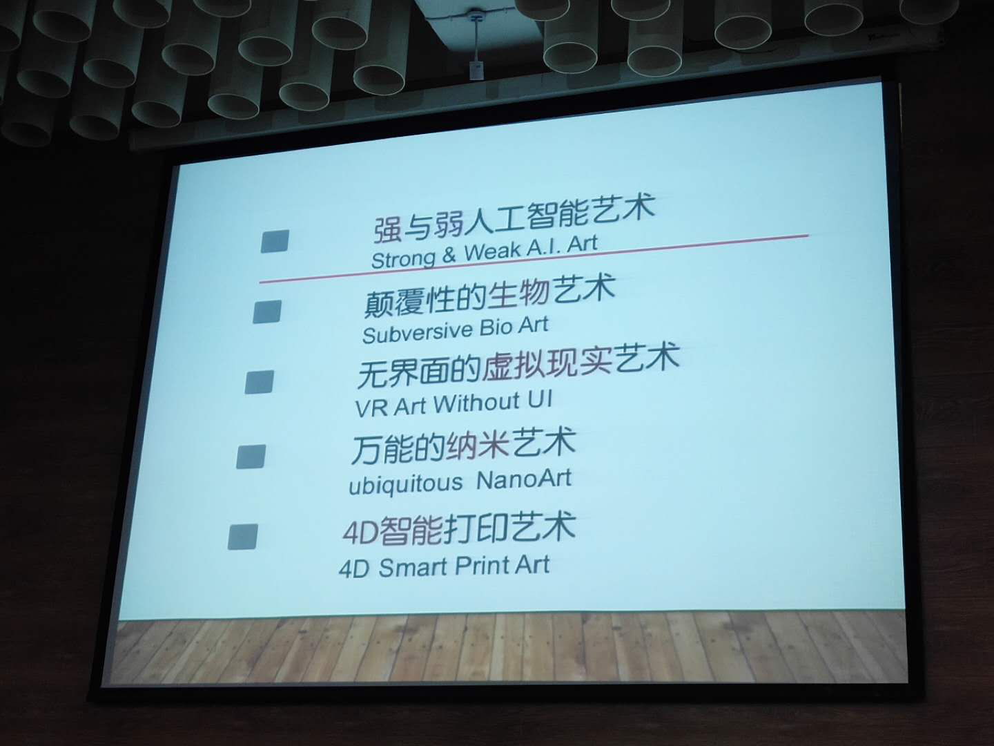 講座共分為五部分:I藝術(shù)家生命體重構(gòu)、II藝術(shù)生態(tài)環(huán)境重構(gòu)、III藝術(shù)工具材料重構(gòu)、IV藝術(shù)創(chuàng)造力重構(gòu)、V藝術(shù)與美學(xué)范圍定義重構(gòu)。譚教授提出 “未來指導(dǎo)現(xiàn)在”的藝術(shù)創(chuàng)作觀點(diǎn),并指出,科技作為一種技術(shù)手段,越來越普遍地融入到藝術(shù)創(chuàng)作的領(lǐng)域當(dāng)中,VR、AR 、MR虛擬技術(shù)乃至人工智能都與藝術(shù)有著千絲萬縷的關(guān)聯(lián)。當(dāng)科技智能接近或超越人類智慧狀態(tài)時(shí),其藝術(shù)家生命體、藝術(shù)工具材料、藝術(shù)架構(gòu)定義以及創(chuàng)作美學(xué)內(nèi)涵,都面臨解構(gòu)再重構(gòu)的必要性。