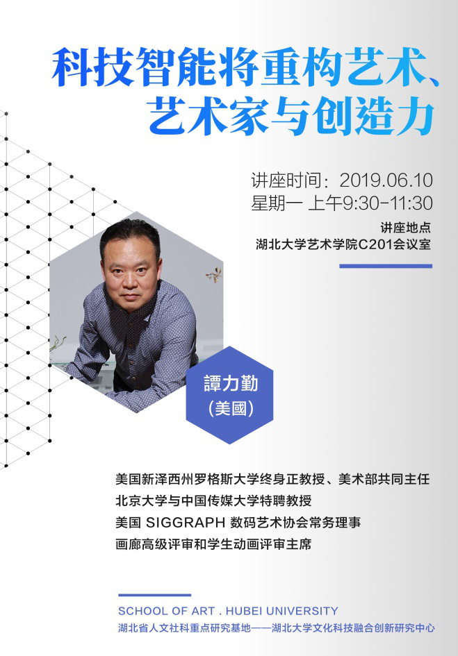 2019年6月10日上午,美國新澤西州羅格斯大學(xué)終身教授和美術(shù)部共同主任,譚力勤教授到湖北大學(xué)為藝術(shù)學(xué)院的師生作了題為“科技智能將重構(gòu)藝術(shù)、藝術(shù)家和創(chuàng)作力”的專題學(xué)術(shù)講座,探討未來藝術(shù)在科技奇點(diǎn)沖擊下的蛻變,美國媒體稱他“革命性的藝術(shù)家”。主題演講由動(dòng)畫與數(shù)字媒體藝術(shù)系主任、湖北省人文社科重點(diǎn)研究基地——文化科技融合創(chuàng)新研究中心主任余日季教授作學(xué)術(shù)主持。
