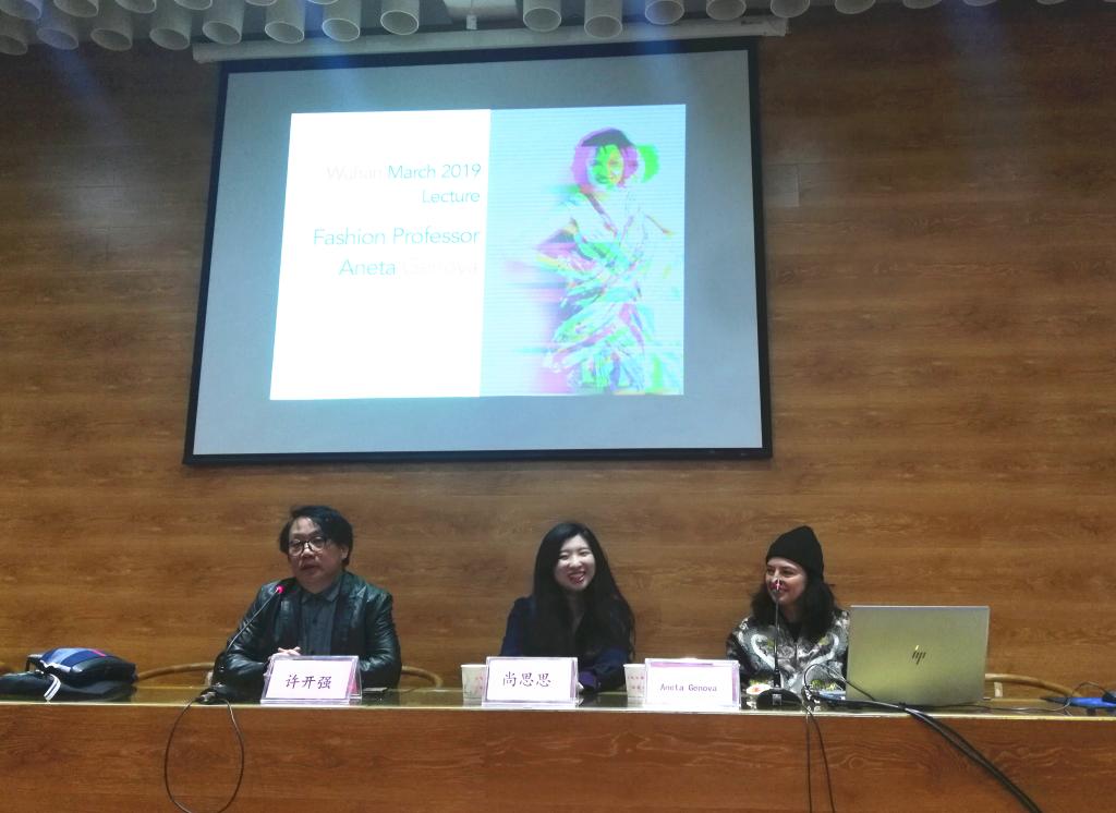 (從左至右)湖北大學(xué)藝術(shù)學(xué)院院長許開強教授、湖北第二師范學(xué)院教師(翻譯)尚思思老師、美國帕森斯設(shè)計學(xué)院時尚設(shè)計專業(yè)Aneta Genova教授