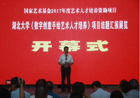 8月27日,由國家藝術(shù)基金資助、湖北大學(xué)主辦的國家藝術(shù)基金2017年度人才培養(yǎng)資助項(xiàng)目——湖北大學(xué)數(shù)字創(chuàng)意手繪藝術(shù)人才培養(yǎng)項(xiàng)目項(xiàng)目結(jié)題匯報(bào)展在湖北省圖書館開幕。湖北省文化廳李耀華副廳長、文藝處管成文處長、田松處長、肖華慧處長、湖北省圖書館賀定安書記、王濤副館長、湖北省美術(shù)家協(xié)會劉春冰秘書長、湖北省美術(shù)家協(xié)會副主席、湖北大學(xué)名譽(yù)院長董繼寧、楚天傳媒周潔董事長、湖北大學(xué)錢建國副校長、江漢大學(xué)美術(shù)學(xué)院王心耀院長、武漢紡織大學(xué)傳媒學(xué)院沈祥勝院長、武漢插畫人張?zhí)v董事長以及承辦單位湖北大學(xué)藝術(shù)學(xué)院黃家發(fā)書記、許開強(qiáng)院長、項(xiàng)目主持人李碧紅教授、項(xiàng)目授課教師代表和學(xué)員代表等出席展覽開幕儀式。