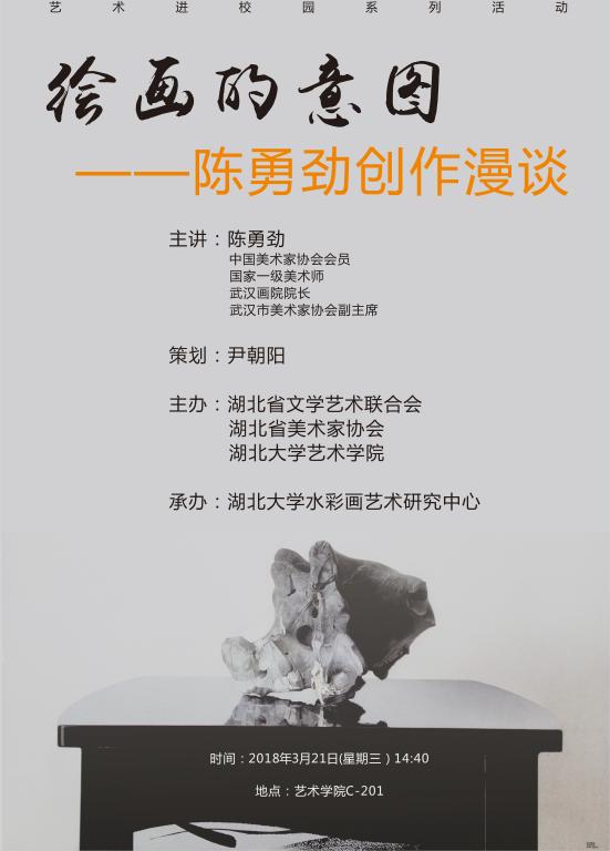 3月21日下午,藝術(shù)學(xué)院迎來了中國著名水彩畫家陳勇勁先生的“繪畫的意圖--陳勇勁創(chuàng)作漫談”學(xué)術(shù)講座,此次活動由湖北省文聯(lián)、湖北省美術(shù)家協(xié)會、湖北大學(xué)藝術(shù)學(xué)院主辦,湖北大學(xué)水彩畫藝術(shù)研究中心承辦,為“藝術(shù)進(jìn)校園”系列活動之一。講座在湖北大學(xué)藝術(shù)學(xué)院學(xué)術(shù)報(bào)告廳C-201舉行,水彩中心主任尹朝陽教授策劃并擔(dān)任此講座的學(xué)術(shù)主持,藝術(shù)學(xué)院副院長馬新平和李碧紅、楊帆、張希承、彭茹娜、劉靖戎、張國剛、李晶濤、王哲雨、周禺等教師出席了本次活動,藝術(shù)學(xué)院學(xué)生踴躍參加,報(bào)告廳座無虛席。