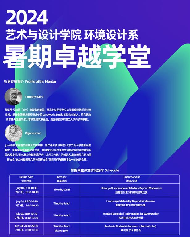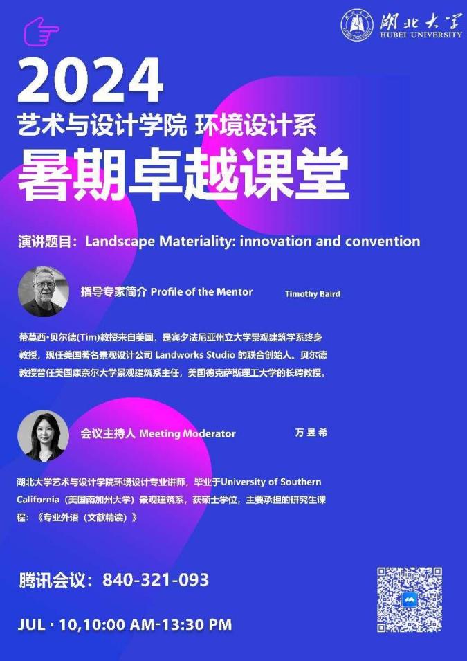 2024年7月1日至10日,湖北大學藝術與設計學院環(huán)境設計系與武漢理工大學環(huán)境設計系聯(lián)合舉辦的“暑期卓越學堂”,邀請了來自美國賓夕法尼亞洲立大學景觀建筑學系終身教授蒂莫西·貝爾德,做題為“現(xiàn)代景觀材料的創(chuàng)新運用”的專題講座。講座由湖北大學藝術與設計學院萬昱希老師主持。