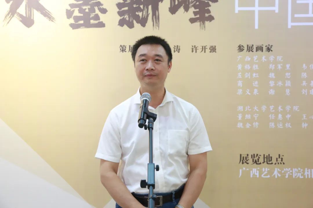 中國畫學院/漓江畫派學院院長鐘濤教授教授對蒞臨畫展的領導、嘉賓、同學們表示熱烈歡迎,并表示此次展覽首先為即將到來的中國共產黨生日獻禮,湖北、廣西的藝術家通過精心創(chuàng)作的藝術作品,豐富人民的生活和校園文化,也是踐行“為人民服務”宗旨的切實體現,并將穩(wěn)固推進兩地高校聯(lián)合辦展機制。相信通過此次聯(lián)展及學術活動,能為兩地藝術高校創(chuàng)作帶來新的靈感,為兩地高校的藝術教學帶來新的思路,加強湖北、廣西高校的鏈接,達到學院水墨“新高峰”!