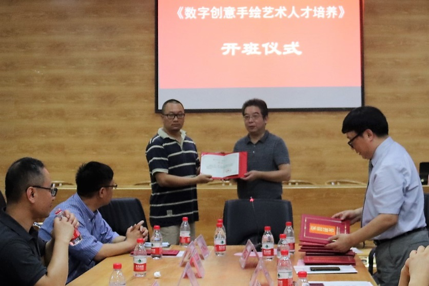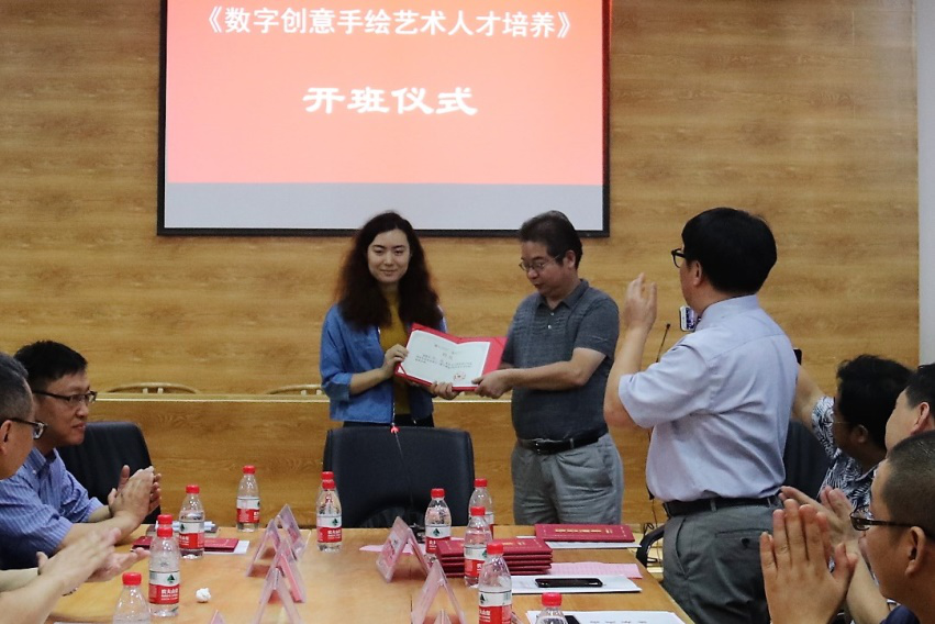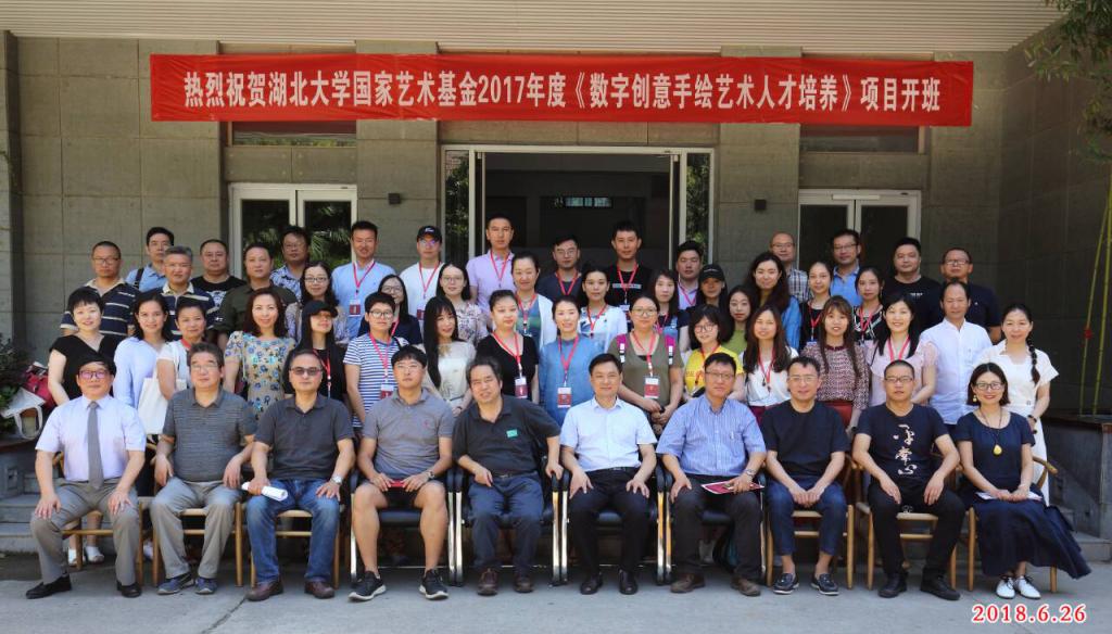 6月26日,由我校藝術學院承辦的國家藝術基金2017年度人才培養(yǎng)資助項目“數(shù)字創(chuàng)意手繪藝術人才培養(yǎng)”正式開班。湖北大學副校長顧豪爽教授、湖北省文化廳文藝處處長田松先生、華中師范大學美術學院院長徐曉庚教授、武漢紡織大學傳媒學院院長沈祥勝教授、湖北美術學院工業(yè)設計系主任李梁軍教授、湖北工業(yè)大學設計學院院長石元伍教授、湖北大學社科處黃江英副處長、湖北大學藝術學院黃家發(fā)書記、許開強院長、馬新平副院長、潘峰副院長以及武漢大學翁子揚教授、武漢紡織大學傳媒學院葉科教授、中南財經(jīng)政法大學新聞與傳播學院動畫系主任吳博教授、武漢工商學院藝術與設計學院數(shù)字媒體藝術系主任徐鄭冰教授、武漢插畫人辰星動漫CEO張巍先生、湖北大學尹朝陽教授、譚崇正教授、李鋼教授、余日季教授、楊帆教授、王紅教授、張立教授、彭茹娜教授、鄭林教授、劉靖戎教授、楊高鈺教授、李晶濤老師、向垚老師等數(shù)字手繪藝術領域的資深專家導師出席。