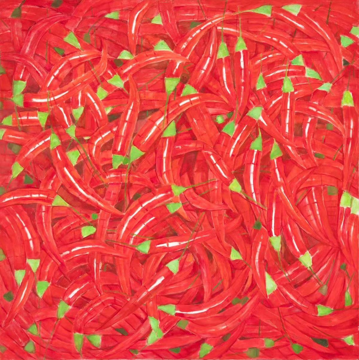 “紅、橙、黃、綠、青、藍(lán)、紫、黑、白,呈現(xiàn)出飽和色彩的果蔬,有種來自于大自然的力量感,雄壯而充實(shí)。我采用大自然給予果蔬的色彩,進(jìn)行藝術(shù)的科學(xué)梳理,創(chuàng)作出《紅與橙》《黃與綠》《紅、黃、藍(lán)》《豐碩》等作品。每種構(gòu)成的色彩都是一次生命的顫動(dòng)與洗禮,值得我們?nèi)プ鹬嘏c敬畏。”湖北大學(xué)藝術(shù)學(xué)院美術(shù)系油畫專業(yè)教授、碩士生導(dǎo)師李碧紅說。