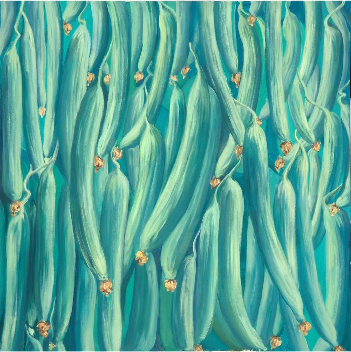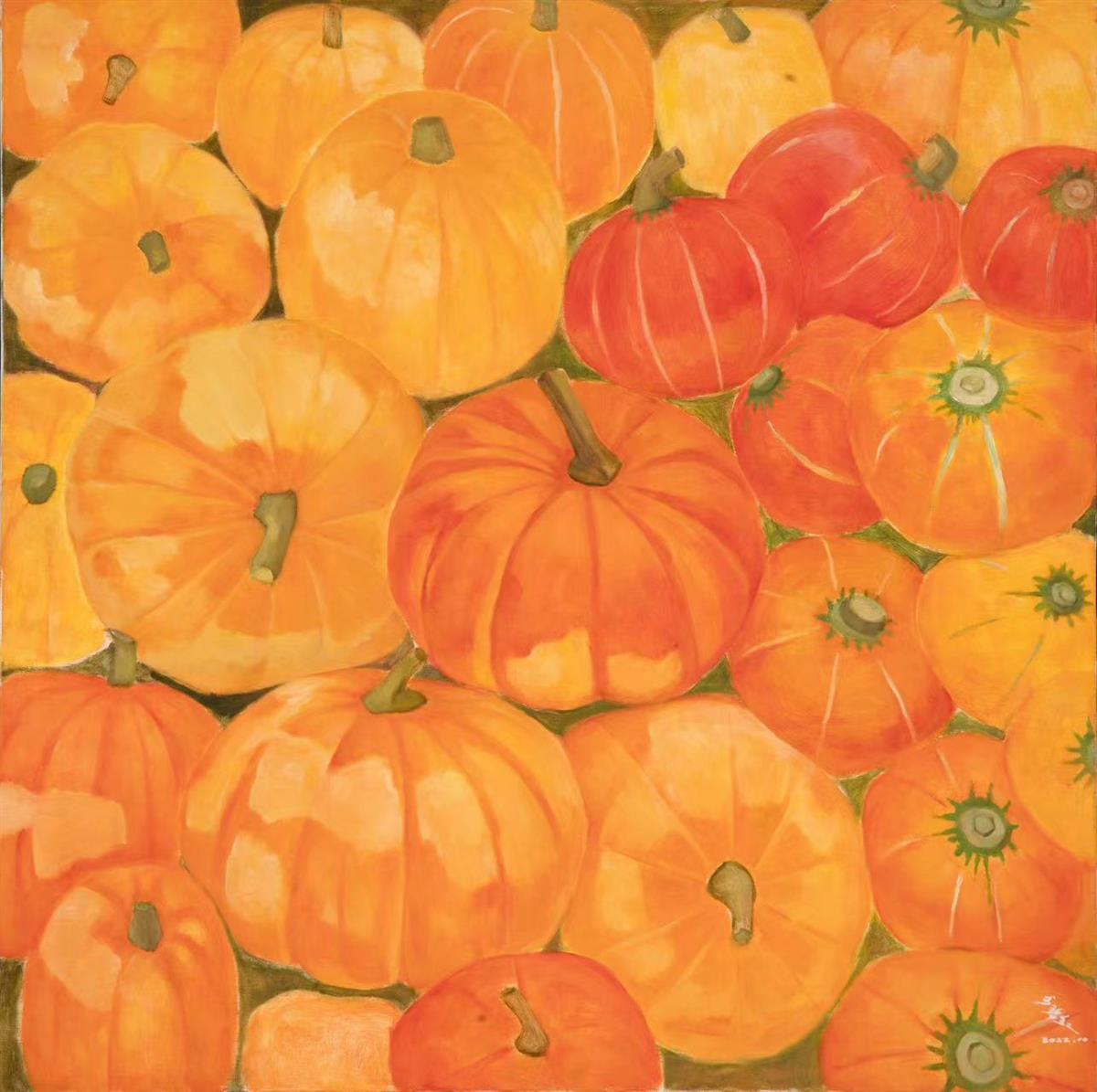 李碧紅說:“果實(shí)和蔬菜也是中國勞動(dòng)人民的成果體現(xiàn),是鄉(xiāng)村建設(shè)的美好呈現(xiàn)。我選擇這類題材,更有廣泛的傳播性。傳播著這個(gè)時(shí)代,人民對美好生活的向往。把平凡的果蔬系列用‘豐碩’色彩藝術(shù)的手段表現(xiàn)出來,畫面單純物像色彩,體現(xiàn)生命的本質(zhì)是質(zhì)樸純真、自由無羈,生命的情態(tài)是天真爛漫、渾然天融。每幅畫的色彩讓我們回到了自然的最初狀態(tài),天真無邪。似水流年,每年都會(huì)開花,每年都會(huì)結(jié)果,那么迷人;豐碩的色彩,生生不息,這就是生命的偉大。”