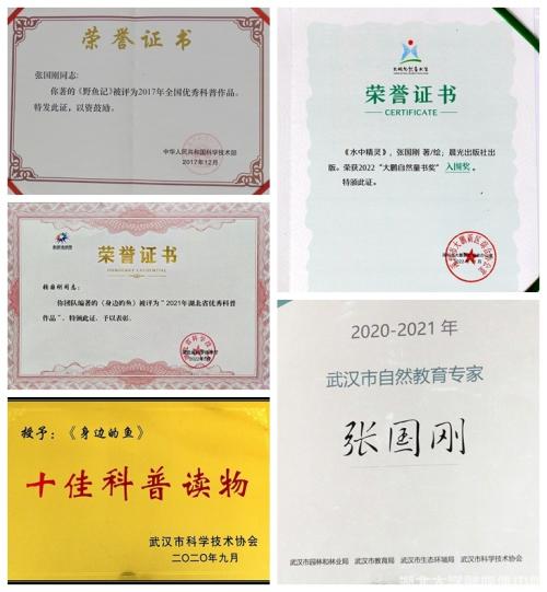 《野魚記》先后獲得2016年首屆“大鵬自然好書獎(jiǎng)”提名、第六屆“中華優(yōu)秀出版物獎(jiǎng)圖書獎(jiǎng)”、2017年科技部“全國(guó)優(yōu)秀科普作品獎(jiǎng)”。其后,張國(guó)剛又先后出版《中國(guó)原生魚水彩繪》《身邊的魚》《水中精靈》等講述本土原生淡水魚的科普書籍,《身邊的魚》獲評(píng)2021年湖北省優(yōu)秀科普作品,張國(guó)剛本人也獲評(píng)2020-2021年武漢市自然教育專家。