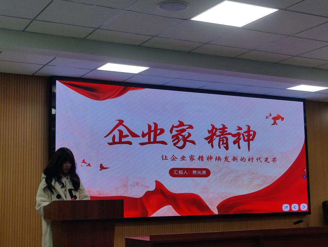 賈光源同學(xué)則圍繞“讓企業(yè)家精神煥發(fā)新的時(shí)代光芒”這一主題,結(jié)合優(yōu)秀企業(yè)家事例,為同學(xué)們帶來別樣生動的分享,啟示大家應(yīng)當(dāng)不斷學(xué)習(xí)和創(chuàng)新、堅(jiān)定理想和追求、承擔(dān)責(zé)任和敢于擔(dān)當(dāng),從而大力弘揚(yáng)企業(yè)家精神,扛起對黨忠誠、勇于拼搏、追求卓越的時(shí)代擔(dān)當(dāng),讓企業(yè)家精神煥發(fā)新的時(shí)代光芒,照亮奮進(jìn)第二個(gè)百年奮斗目標(biāo)的全新征程。