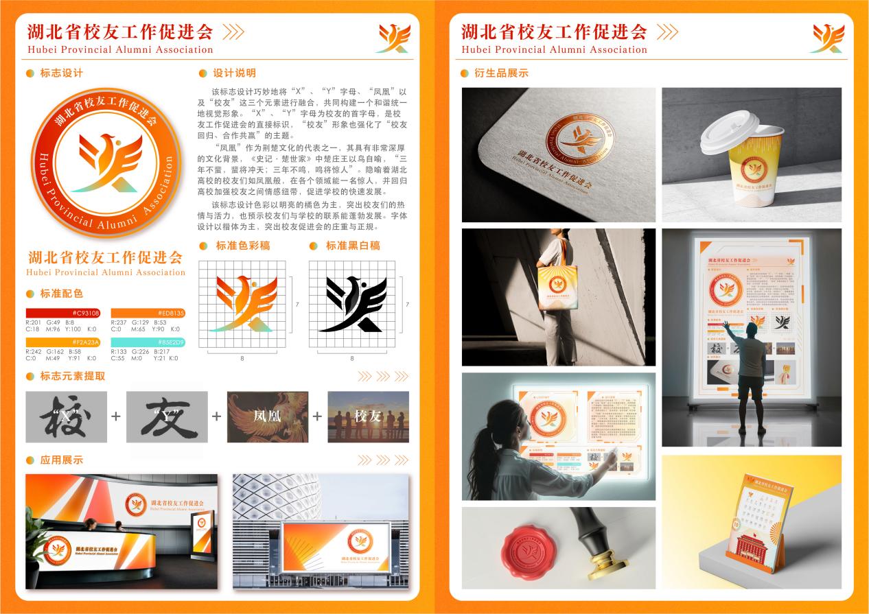 該標(biāo)志設(shè)計(jì)巧妙地將“X”、“Y”字母、“鳳凰”以及“校友”這三個(gè)元素進(jìn)行融合,共同構(gòu)建一個(gè)和諧統(tǒng)一地視覺(jué)形象。“X”、“Y”字母為校友的首字母,是校友工作促進(jìn)會(huì)的直接標(biāo)識(shí),“校友”形象也強(qiáng)化了“校友回歸、合作共贏”的主題;“鳳凰”作為荊楚文化的代表之一,一直具有非常深厚的文化背景,《史記·楚世家》中楚莊王以鳥(niǎo)自喻,“三年不蜚,蜚將沖天;三年不鳴,鳴將驚人”。這隱喻著湖北高校的校友們?nèi)瑛P凰般,在各個(gè)領(lǐng)域能一名驚人,并回歸高校加強(qiáng)校友之間情感紐帶,促進(jìn)學(xué)校的發(fā)展;該標(biāo)志設(shè)計(jì)色彩以明亮的橘色為主,突出校友們的熱情與活力,也預(yù)示校友與學(xué)校的聯(lián)系能蓬勃發(fā)展。字體設(shè)計(jì)以楷體為主,突出校友促進(jìn)會(huì)的莊重。