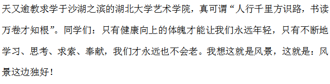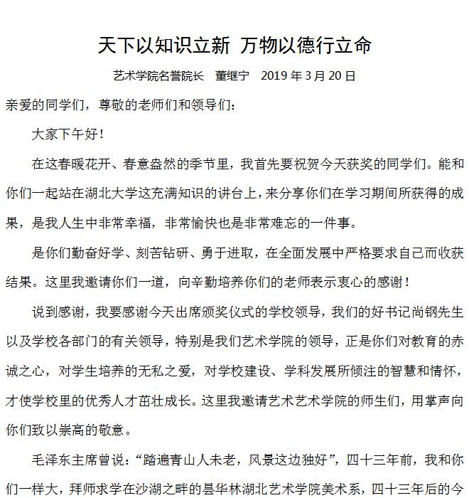 董教授擔(dān)任我校藝術(shù)學(xué)院名譽院長以來,主動參與謀劃藝術(shù)學(xué)院的建設(shè),廣泛爭取各方的資源,為藝術(shù)學(xué)院的發(fā)展作出了突出的貢獻(xiàn)。他說,“天下以知識立新,萬物以德行立命。四十三年前,我拜師求學(xué)在沙湖之畔的曇華林湖北藝術(shù)學(xué)院美術(shù)系,四十三年后的今天又逾教求學(xué)于沙湖之濱的湖北大學(xué)藝術(shù)學(xué)院,這是莫大的淵源,設(shè)立這個獎學(xué)金,就是希望更多的同學(xué)能夠銳意進(jìn)取、刻苦鉆研,在全面發(fā)展中嚴(yán)格要求自己而收獲結(jié)果。”
