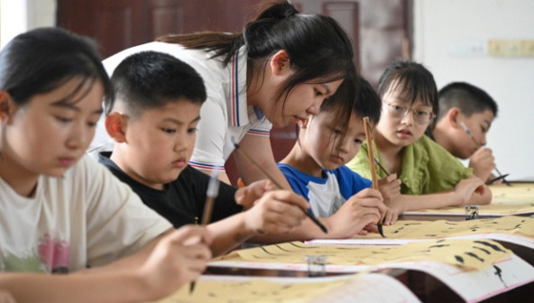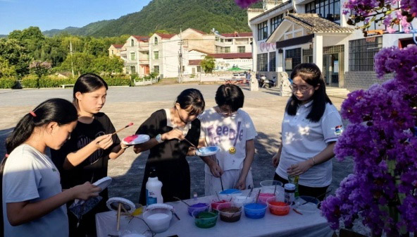在為期半個(gè)月的課程中,“藝青童行”團(tuán)隊(duì)設(shè)計(jì)了一系列富有創(chuàng)意的美育活動(dòng)。書法課堂上,孩子們挖掘本地文化亮點(diǎn),在橫豎撇捺中感受中華優(yōu)秀傳統(tǒng)文化的博大精深;非遺剪紙課上,孩子們用靈巧的雙手剪出心中五彩斑斕的鏤空世界;植物拓染課堂上,孩子們親手操作,感受到了自然中植物的律動(dòng)與生命力;戶外寫生中,孩子們用畫筆捕捉到對戶外自然細(xì)膩的感受,體會(huì)生活的魅力;美育集市上,孩子們與村民們互相交流學(xué)習(xí),豐富了日常的鄉(xiāng)村文化生活,也進(jìn)一步推動(dòng)了鄉(xiāng)村美育發(fā)展。