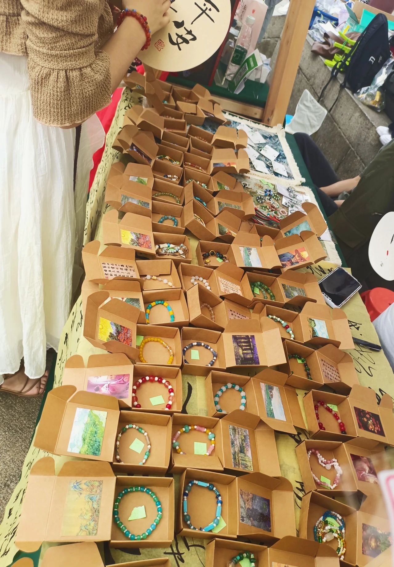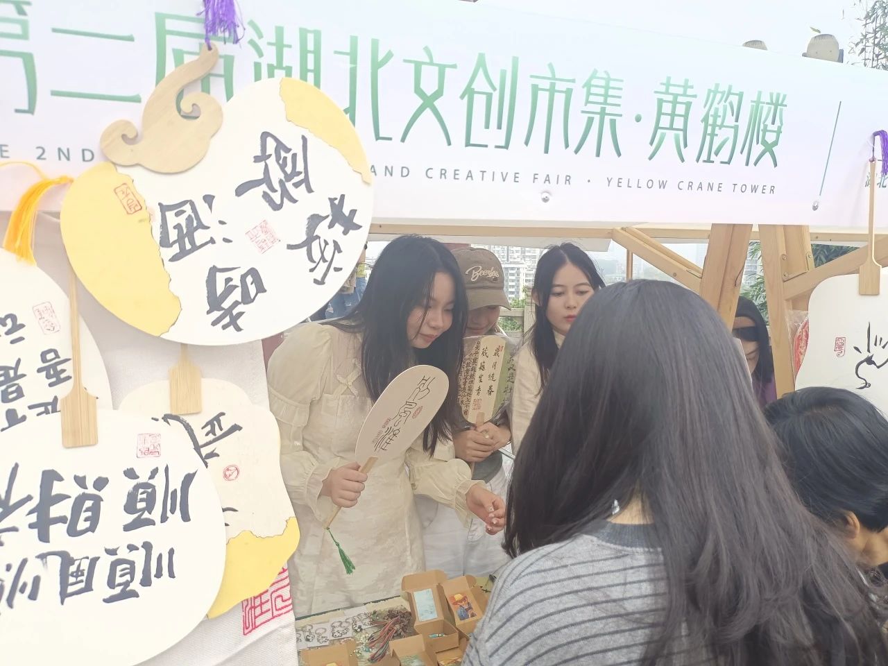 有藝術(shù)學(xué)院同學(xué)設(shè)計(jì)的黃鶴樓主題立體賀卡,賀卡封面采用荊楚文化的漆器用色進(jìn)行色彩設(shè)計(jì),黃鶴樓主樓的形象與編鐘等荊楚文化標(biāo)志物相結(jié)合,封面“黃鶴樓”三個(gè)字以盤長文的風(fēng)格、吊墜裝飾的形式進(jìn)行展示,周邊的浪花代表了大江大湖大武漢的特點(diǎn)。一排排古色古香的扇子,都是同學(xué)們自己采購原件手工制作,再在宣紙上書寫與吉祥文化有關(guān)的文字而成。不僅展臺上各式各樣的小首飾、掛飾等物品出自藝術(shù)學(xué)院同學(xué)們的巧手,飾品的包裝盒也是同學(xué)們設(shè)計(jì)制作。同學(xué)們創(chuàng)作的文創(chuàng)作品受到了游客朋友們的喜愛,攤位前熱鬧非凡。