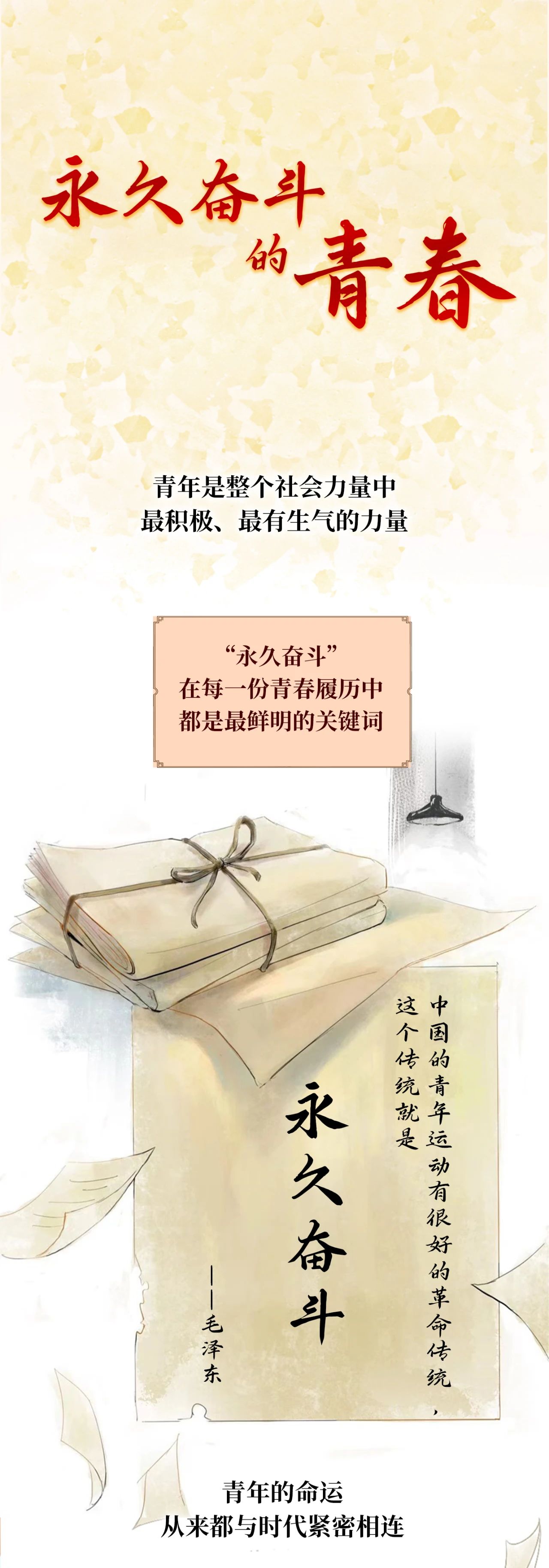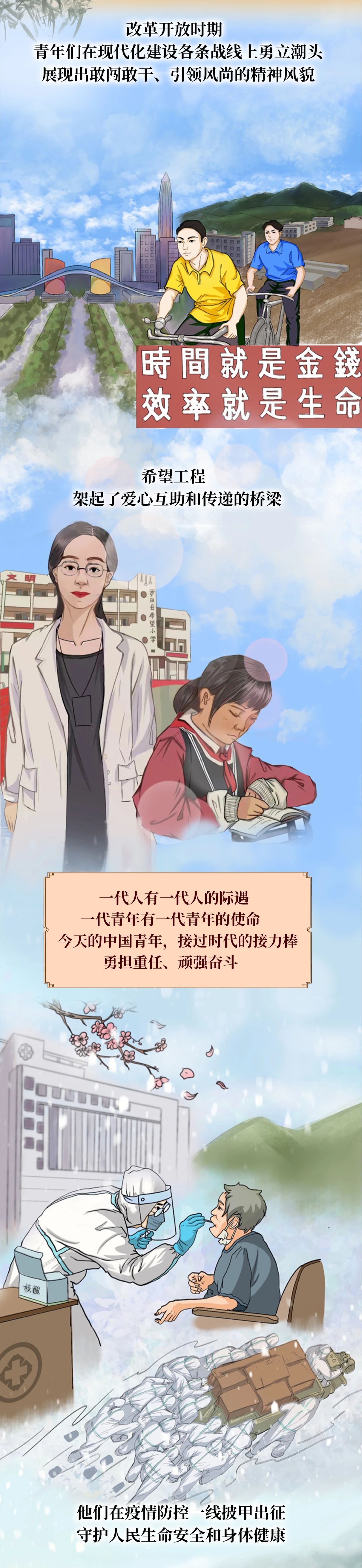 2023年五四前夕,共青團湖北省委員會組織籌備創(chuàng)作五四條漫,經(jīng)湖北大學(xué)團委推薦,藝術(shù)學(xué)院2022級學(xué)生負責(zé)本次創(chuàng)作。輔導(dǎo)員潘念第一時間組織選拔,成立漫畫創(chuàng)作團隊,歷經(jīng)集中研討、小組分工、畫面構(gòu)思、線稿創(chuàng)作、顏色暈染、排版布局、統(tǒng)籌修改等階段,18位學(xué)生參與其中,最終完成條漫《永久奮斗的青春》,于2023年5月4日在“青春湖北”公眾號平臺發(fā)布。