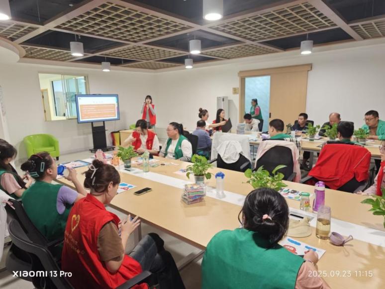 活動(dòng)伊始,志愿者們采用了“一對(duì)一”的貼心陪伴模式。他們不僅是小老師,更是耐心的傾聽(tīng)者和協(xié)助者。對(duì)于行動(dòng)不便的參與者,志愿者會(huì)細(xì)心幫其固定畫(huà)紙、調(diào)換顏料,并用生動(dòng)的語(yǔ)言描述秋日的色彩與形態(tài),引導(dǎo)他們?nèi)ジ惺懿煌螤畹臉?shù)葉模型,用心去“看見(jiàn)”秋天。在創(chuàng)作過(guò)程中,志愿者們也適時(shí)介紹垃圾分類(lèi)知識(shí),例如將落葉歸類(lèi)為廚余垃圾,廢棄畫(huà)筆、顏料包裝等歸類(lèi)為其他垃圾或可回收物,讓環(huán)保理念在輕松互動(dòng)中深入人心。