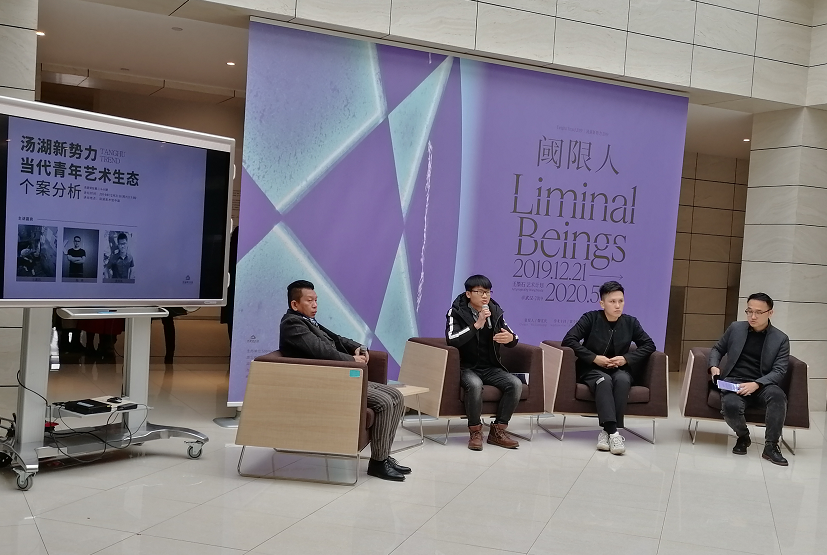 開(kāi)幕式結(jié)束后,由王墨石、鞠騰、雷祺發(fā)三位藝術(shù)家、策展人、批評(píng)家組成的學(xué)術(shù)對(duì)話在湯湖美術(shù)館中庭舉行,湯湖美術(shù)館展覽部主任楊巍主持對(duì)話會(huì)。