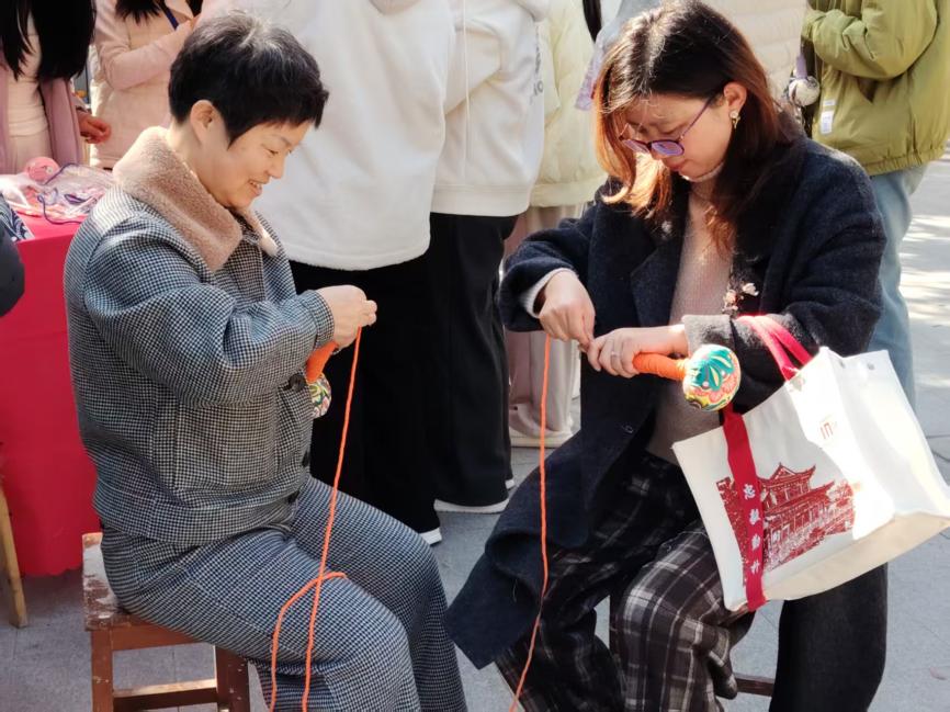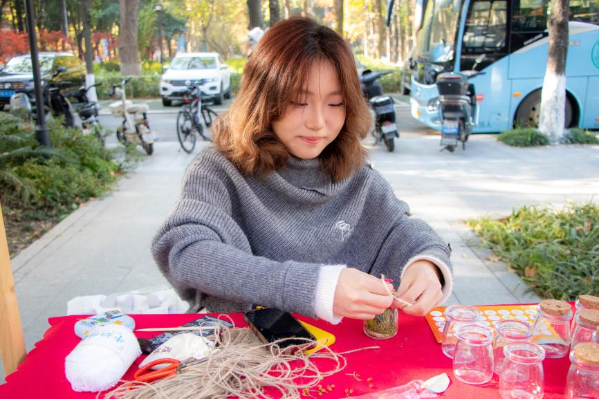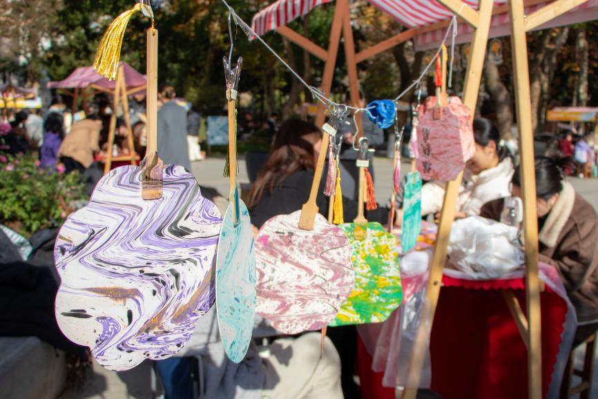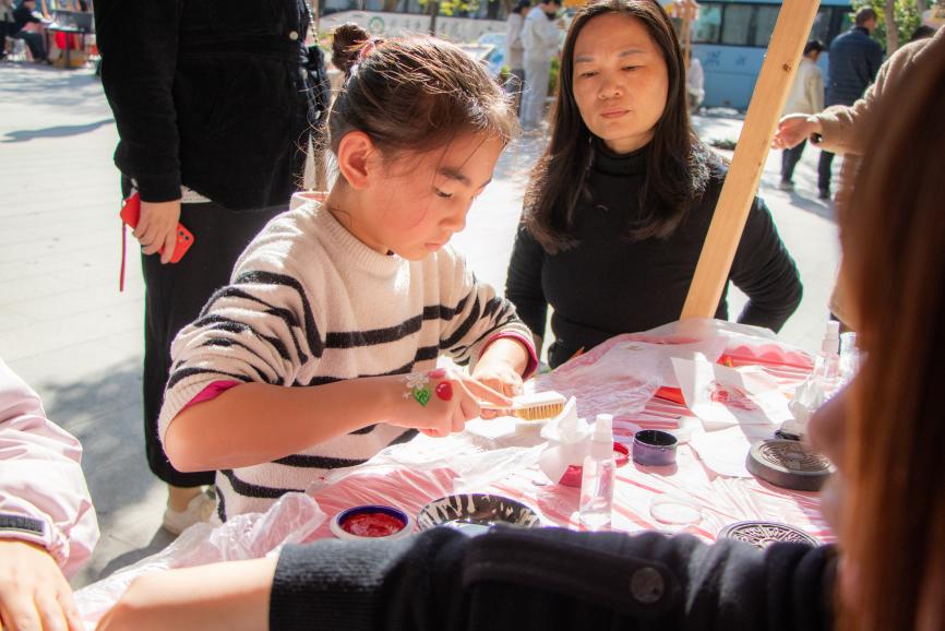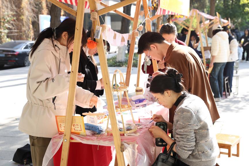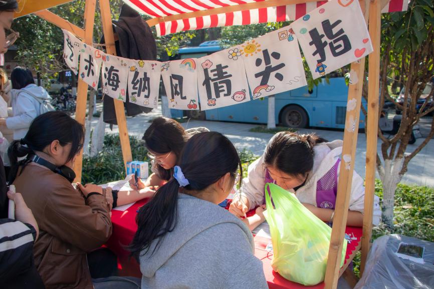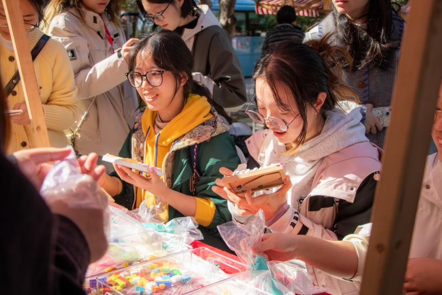 現場32個環(huán)形展位匯聚成創(chuàng)意海洋。非遺漆扇、古法拓印、植物錘染、手作香囊與創(chuàng)意扎染等傳統(tǒng)工藝體驗,讓師生在親手制作中對話千年匠心;手作區(qū)內,編織獨特手機鏈、特調專屬飲品、鑄造香氛蠟燭等環(huán)節(jié),則讓創(chuàng)意在指尖流轉。潮玩藝術區(qū)同樣人氣高漲,從手腕上的海娜繪畫、百變扭扭棒到繽紛拼豆,同學們的奇思妙想在此具象成形,互動游戲更將現場氣氛推向高潮。